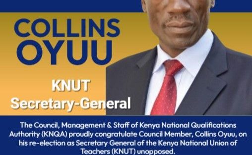 The Council, Management and Staff of the Kenya National Qualifications Authority (KNQA) proudly congratulate Council Member, Collins Oyuu, on his re-election as Secretary General of KENYA NATIONAL UNION OF TEACHERS (KNUT) unopposed.